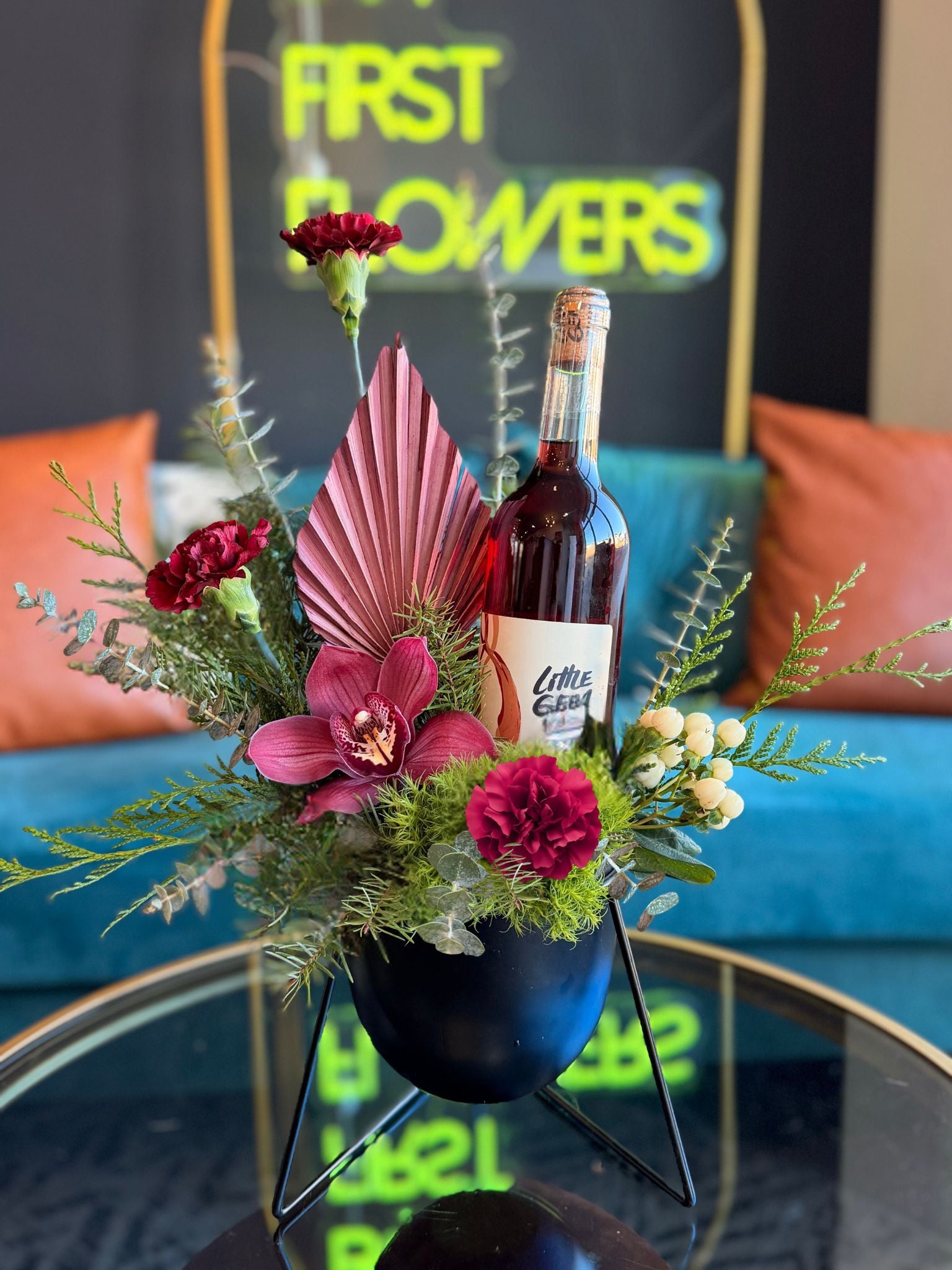 Local wine from Little Gem paired with our fresh seasonal blooms. Does it get any better?!