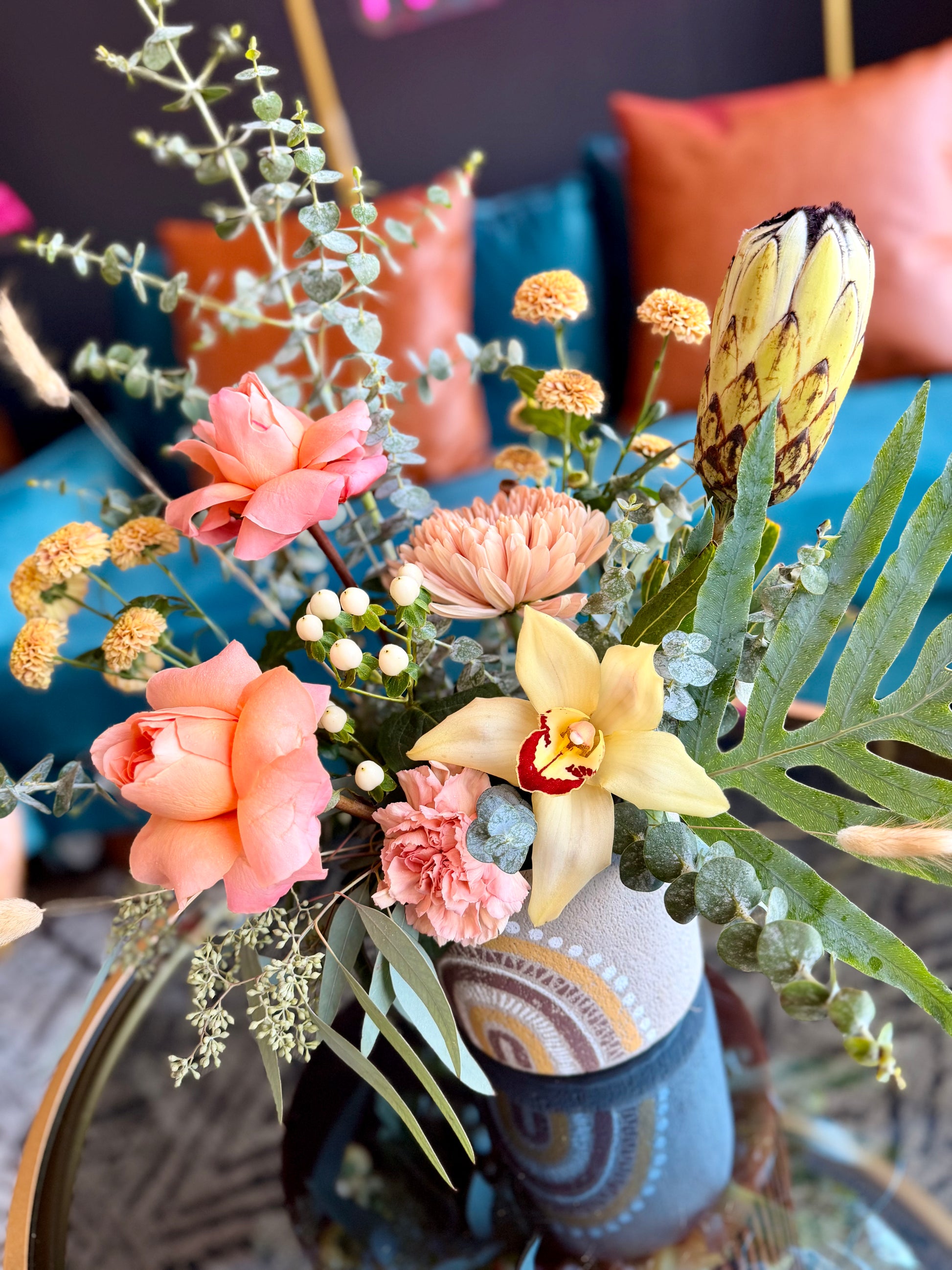Stunning coral roses with fresh bright tropics in a neutral rainbow pot.